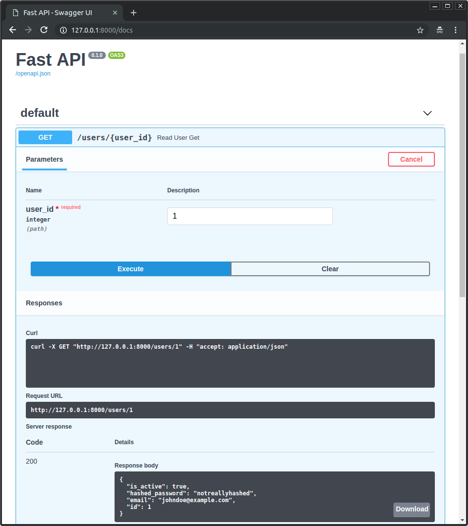 And then, you can open your browser at http://127.0.0.1:8000/docs.